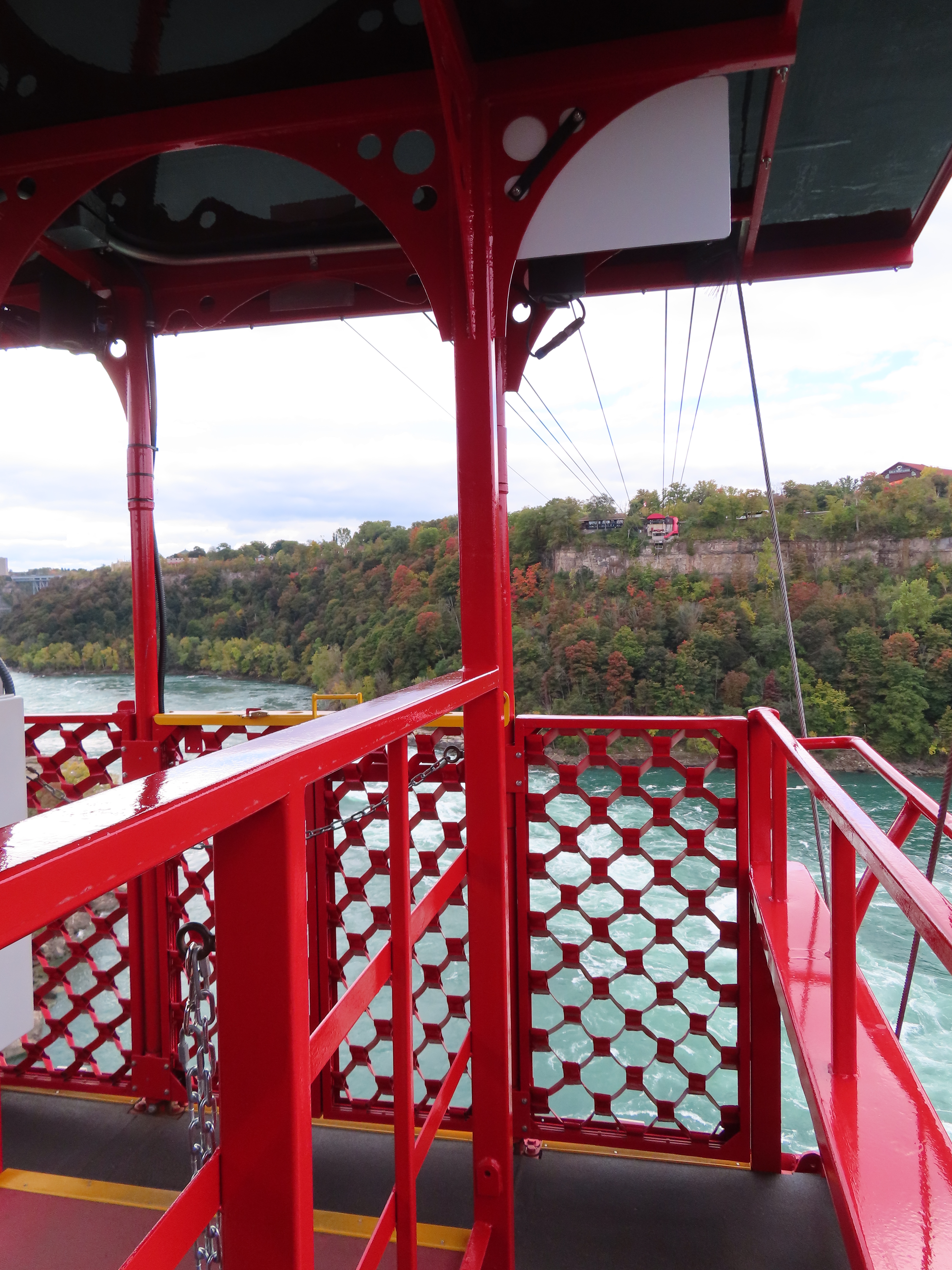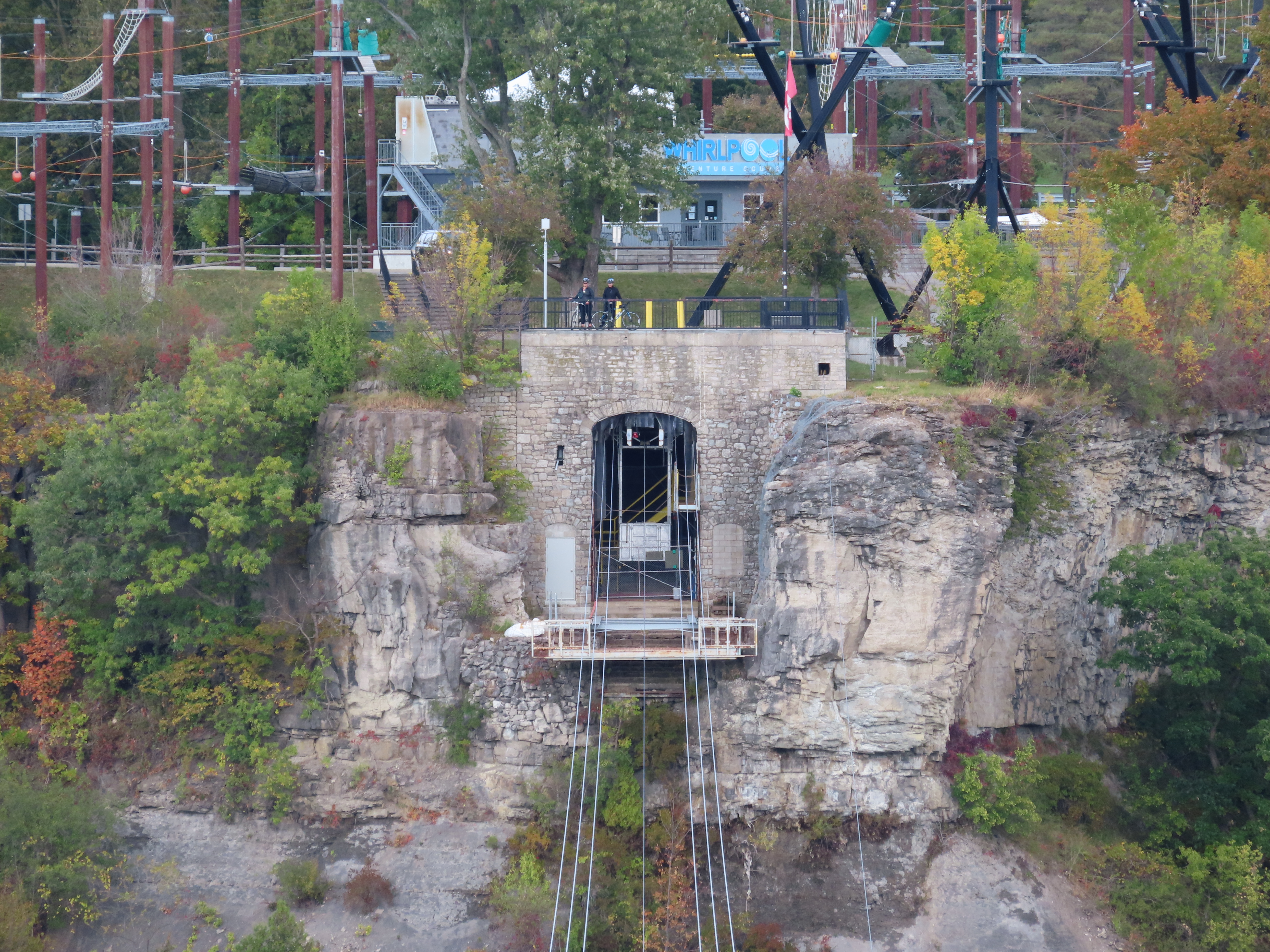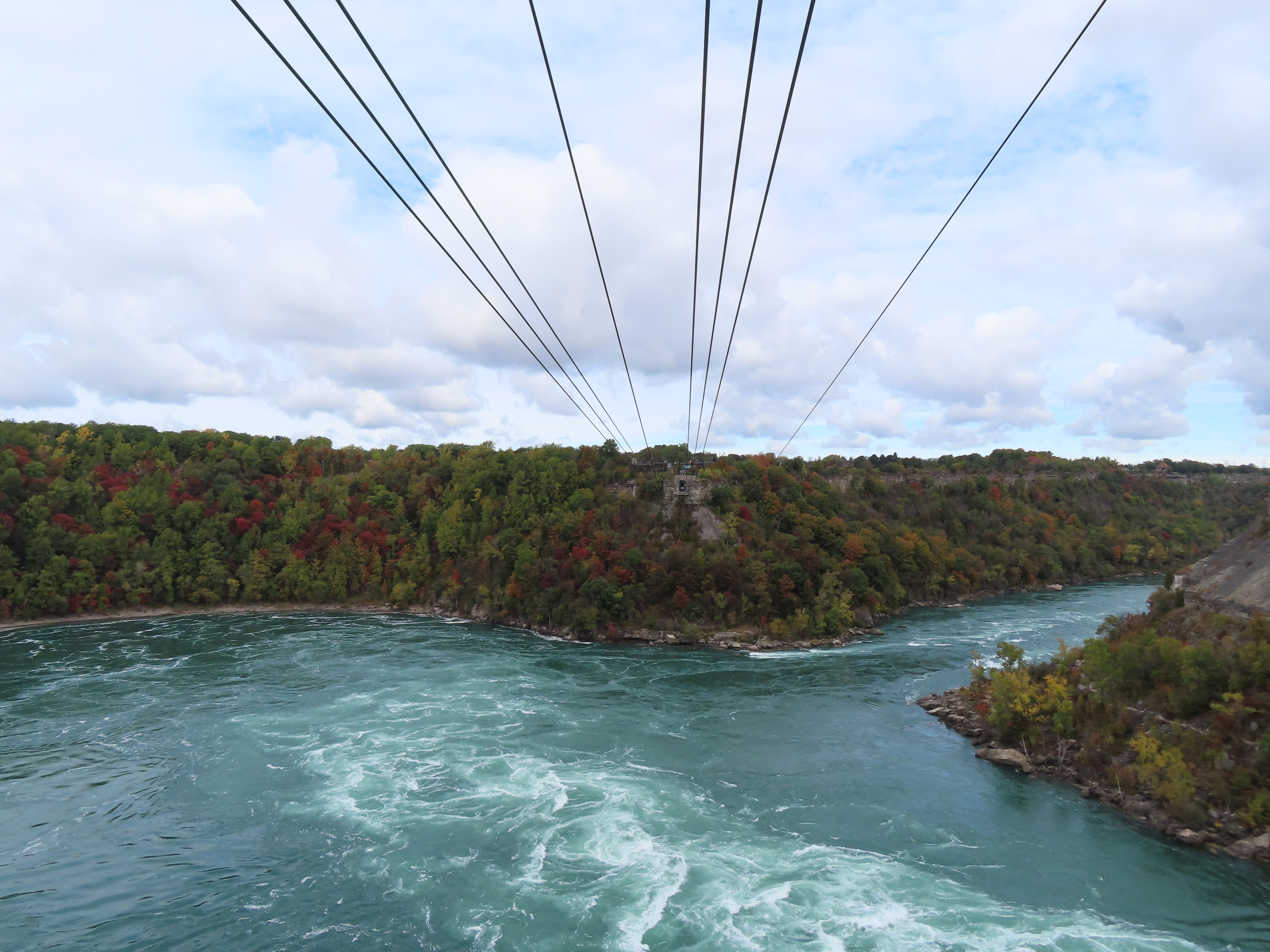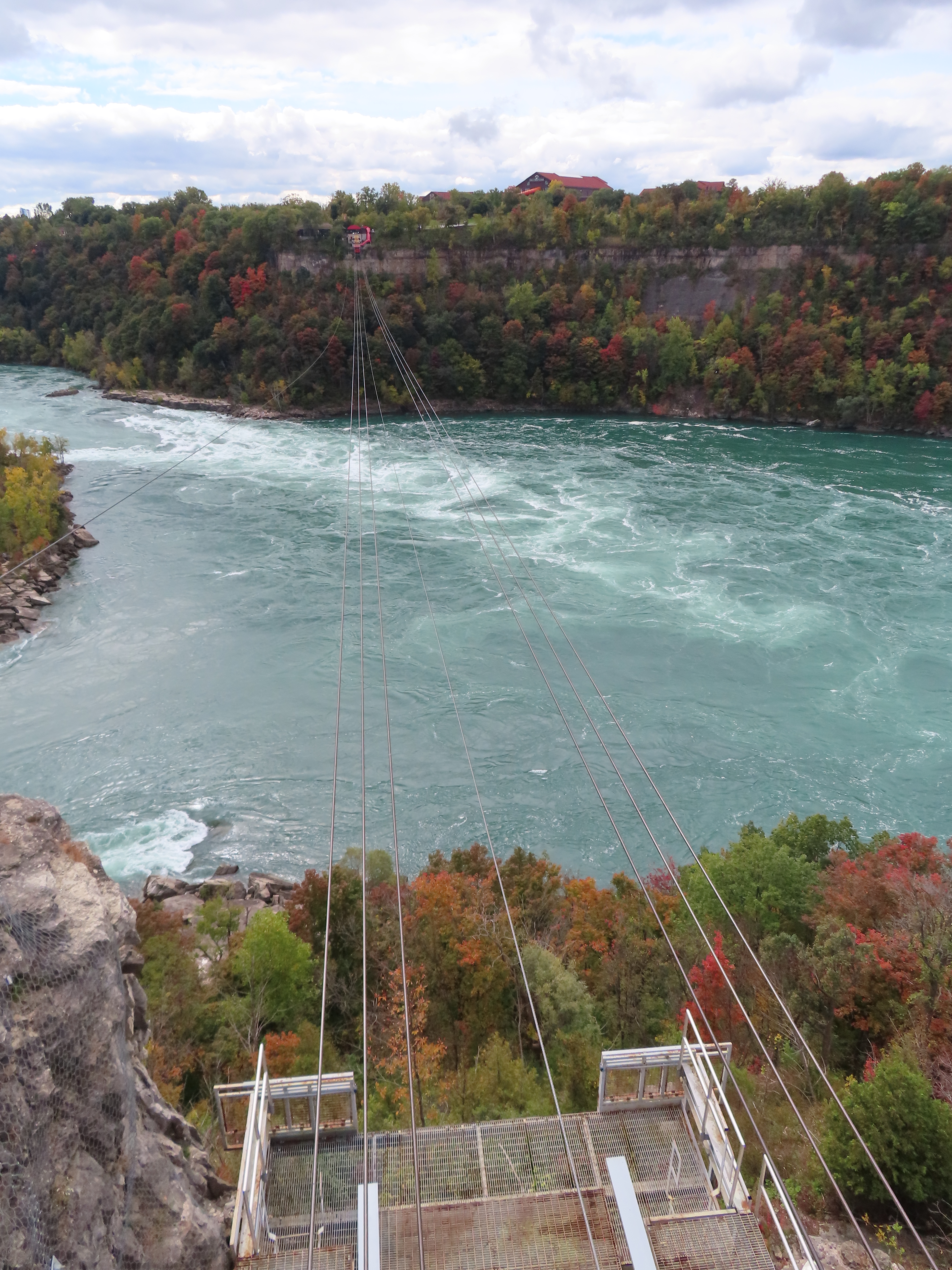 Interestingly enough, both terminals are in Canada. The river takes a sudden, more than 90 degree turn, which is what causes the natural whirlpool. The US/Canada border is in the center of the river and follows the same 90 degree turn. The tram just barely clips the corner of the US border at about a 45 degree angle. Because of this the line is about 1/3 Canada, 1/3 USA, and then 1/3 back in Canada!