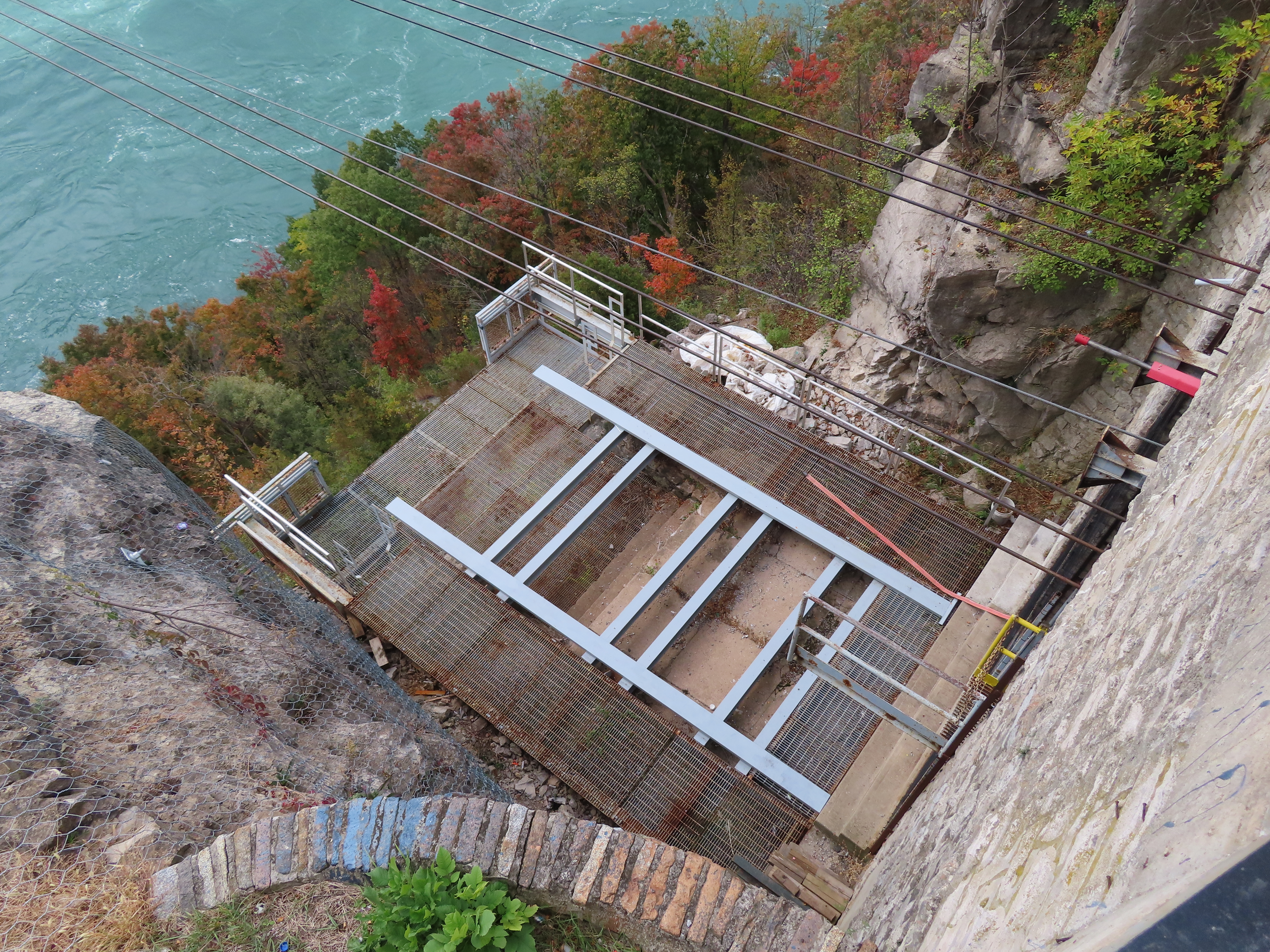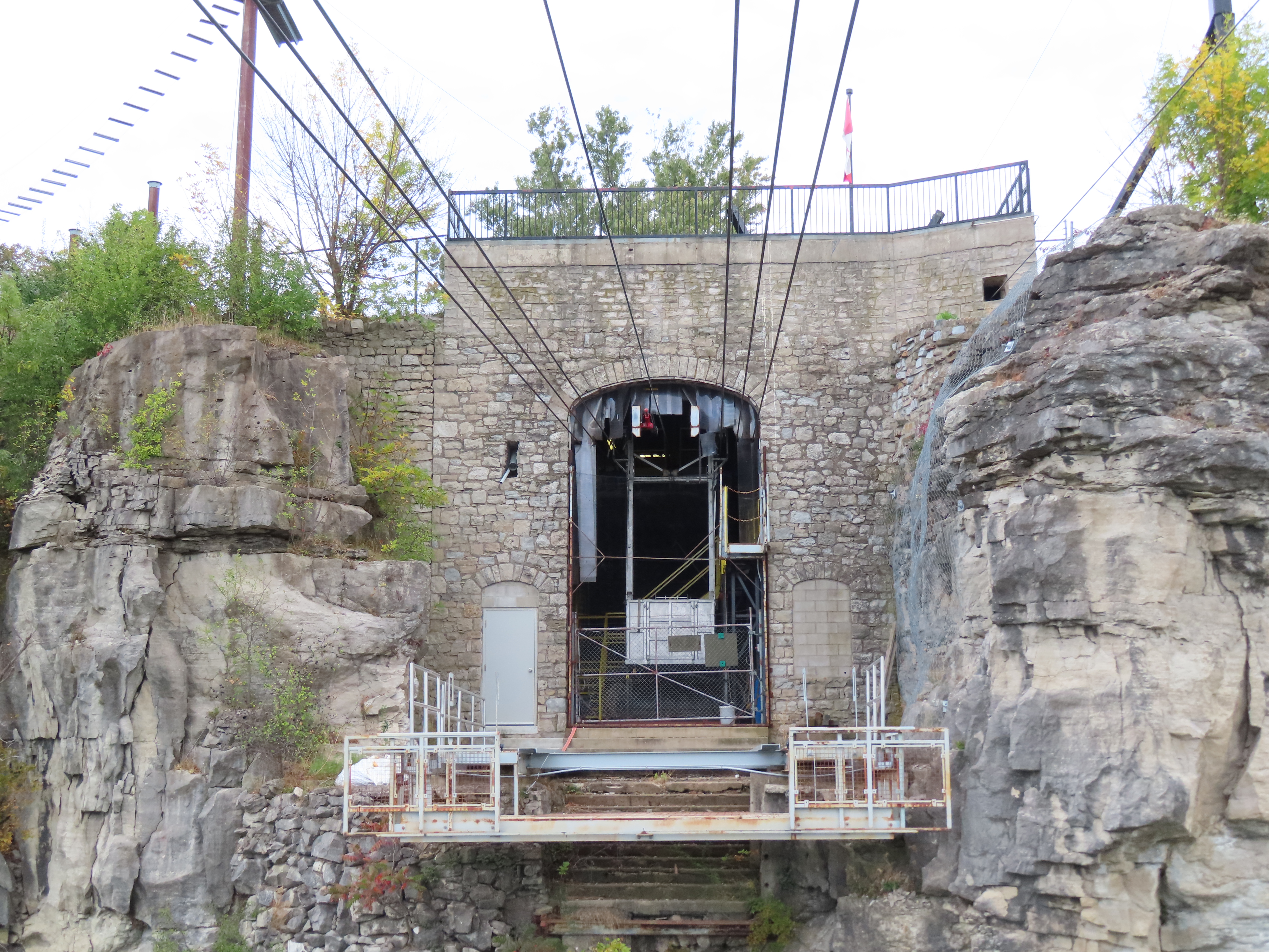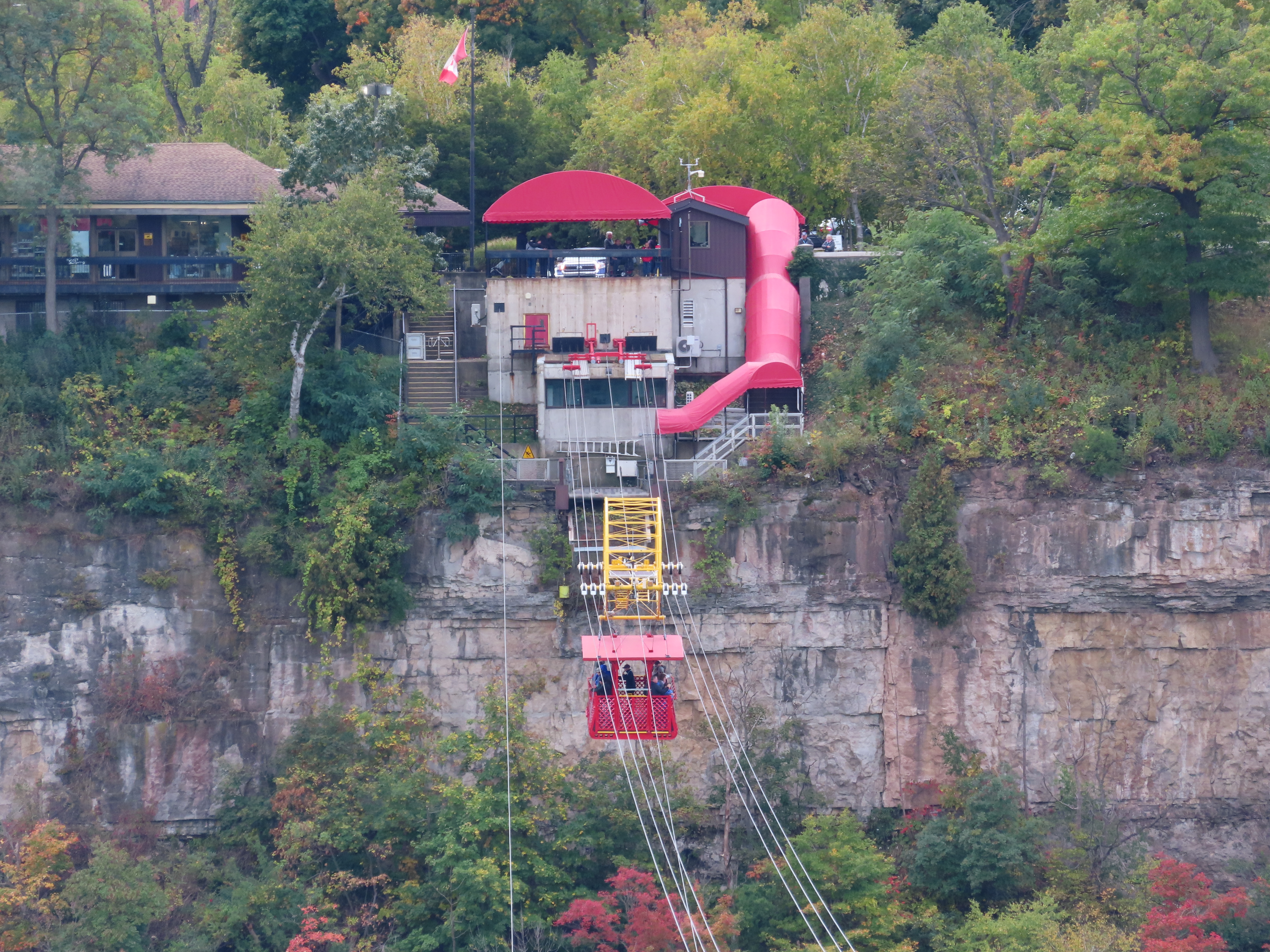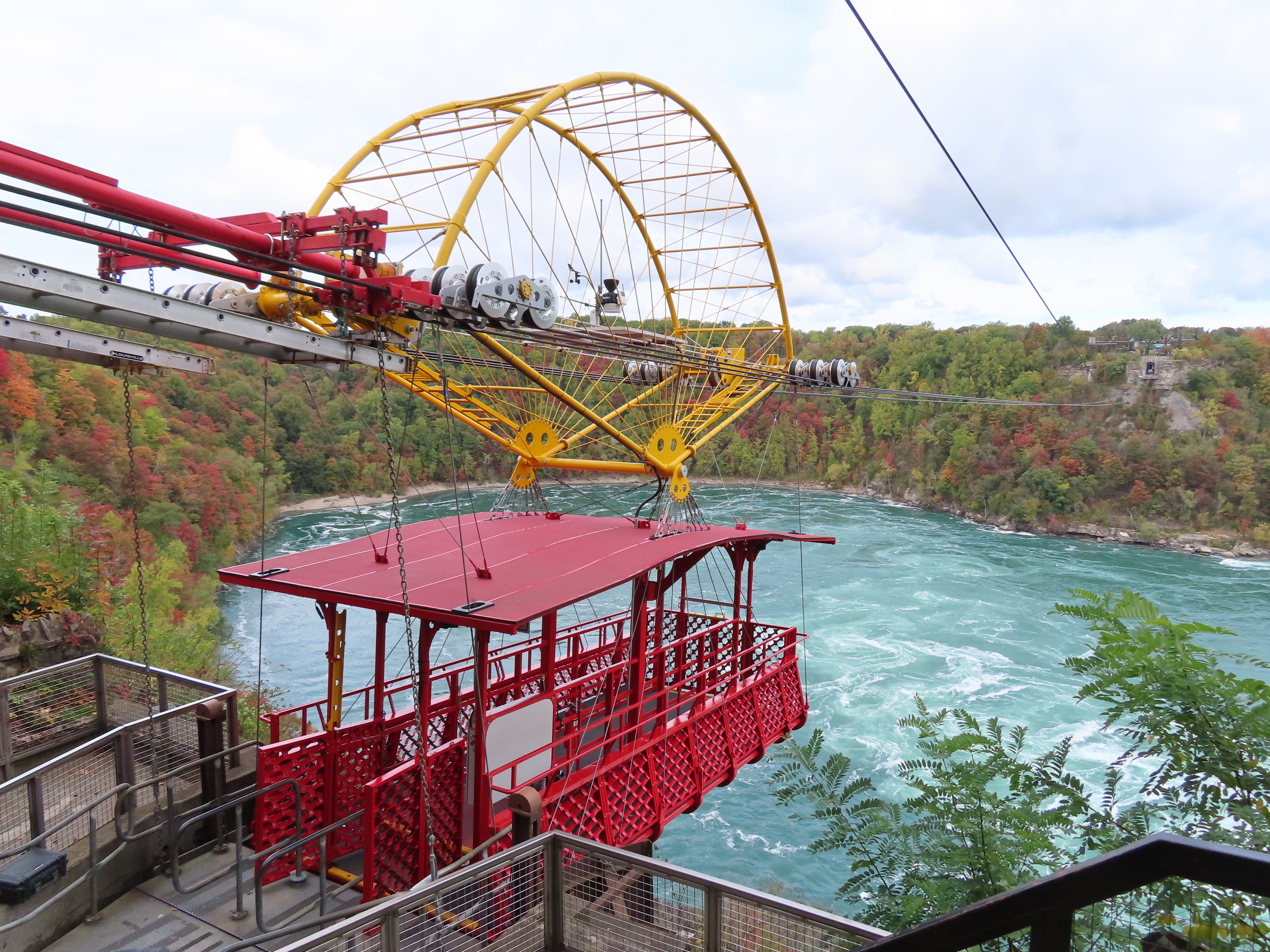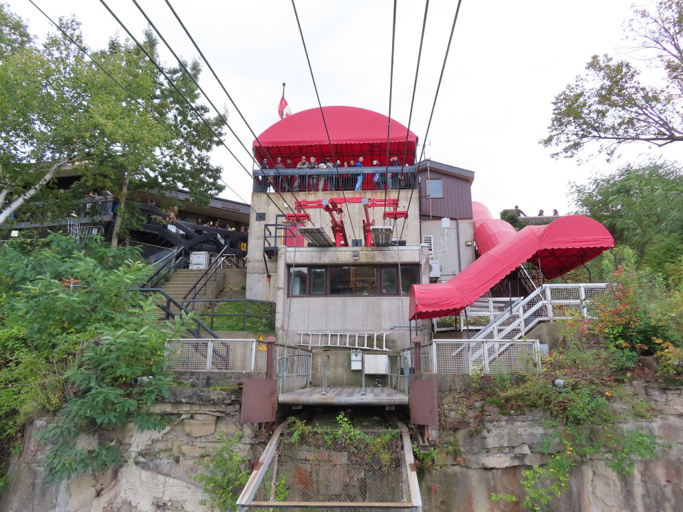 Interestingly enough, both terminals are in Canada. The river takes a sudden, more than 90 degree turn, which is what causes the natural whirlpool. The US/Canada border is in the center of the river and follows the same 90 degree turn. The tram just barely clips the corner of the US border at about a 45 degree angle. Because of this the line is about 1/3 Canada, 1/3 USA, and then 1/3 back in Canada!