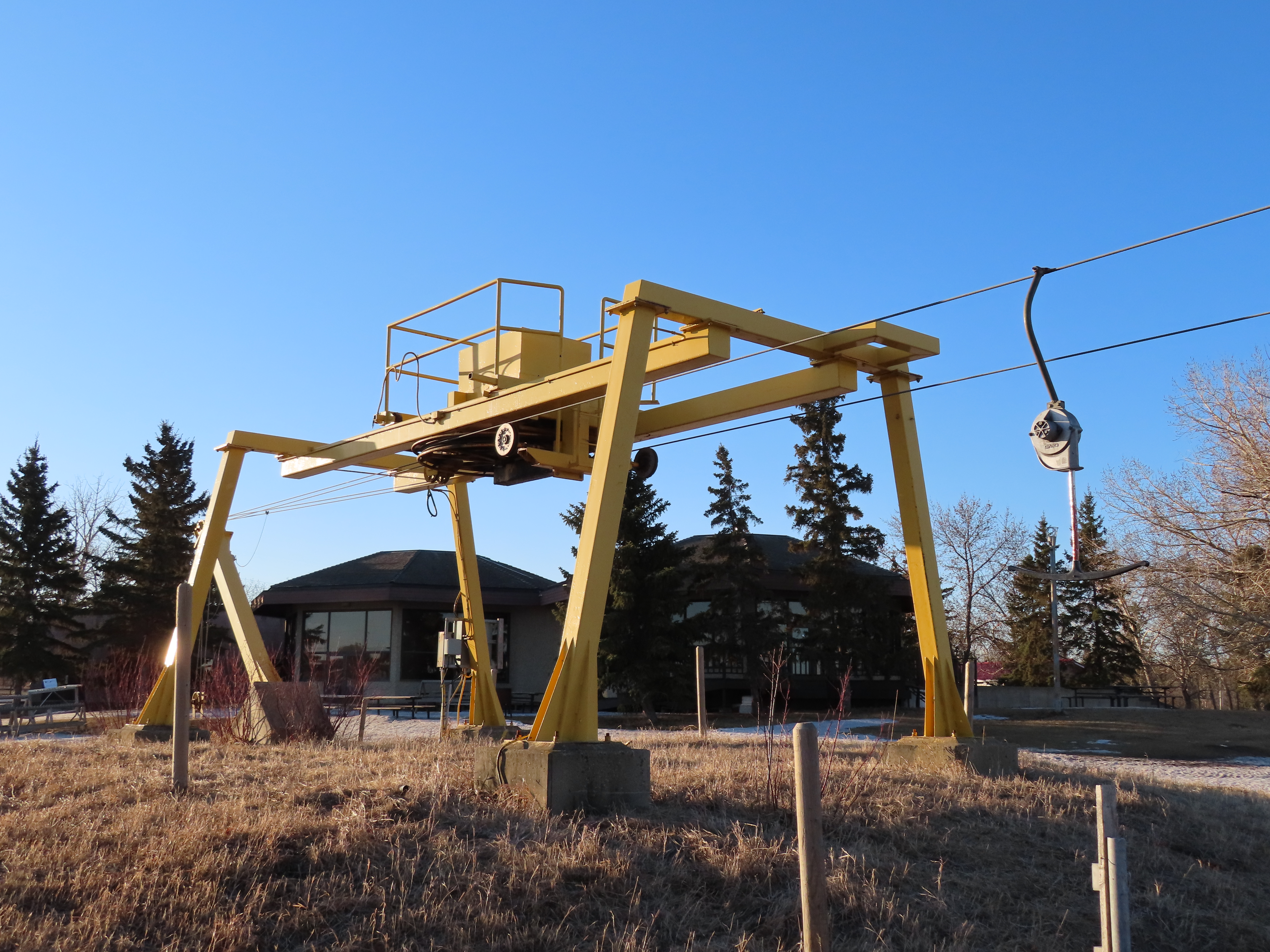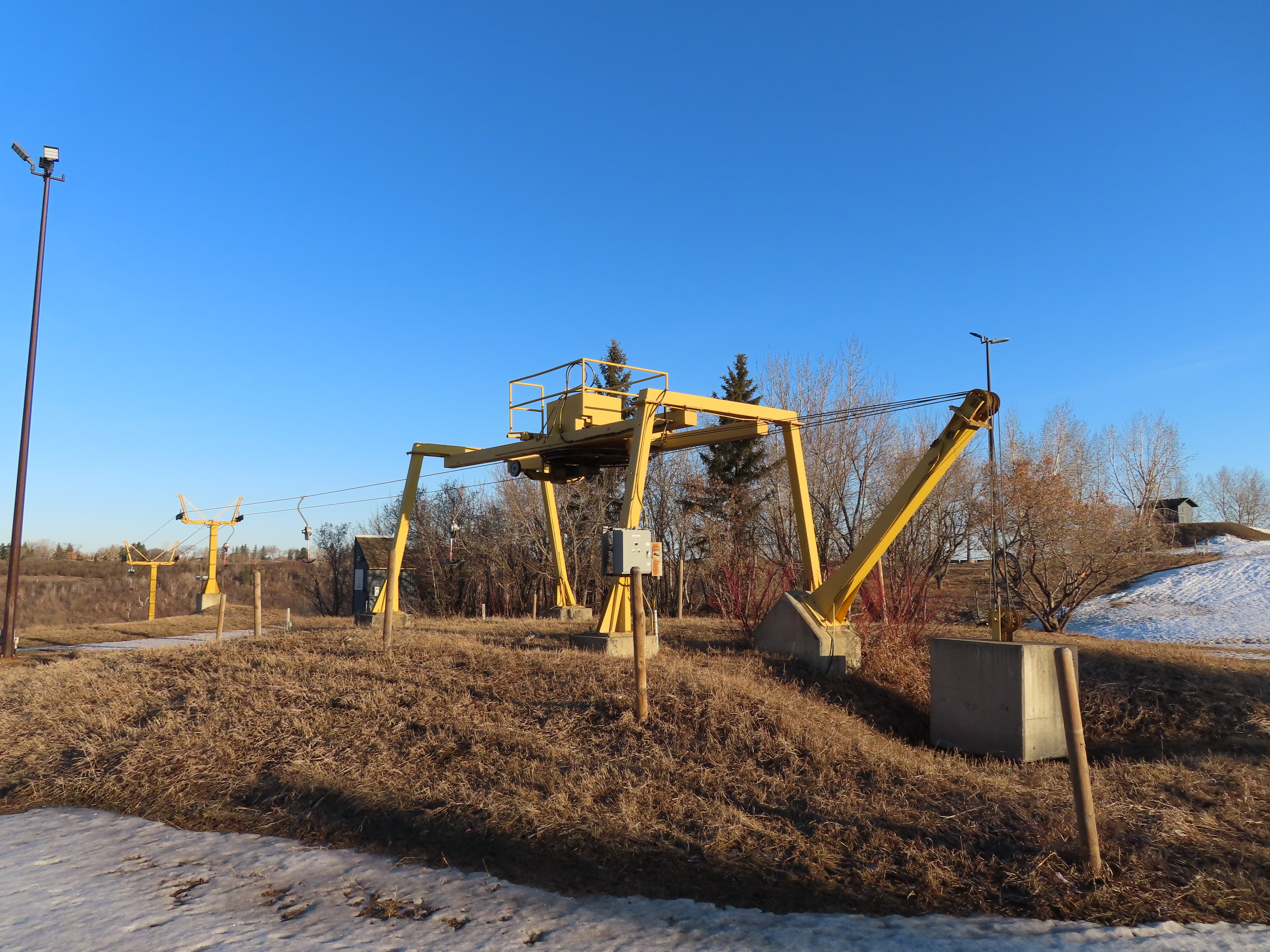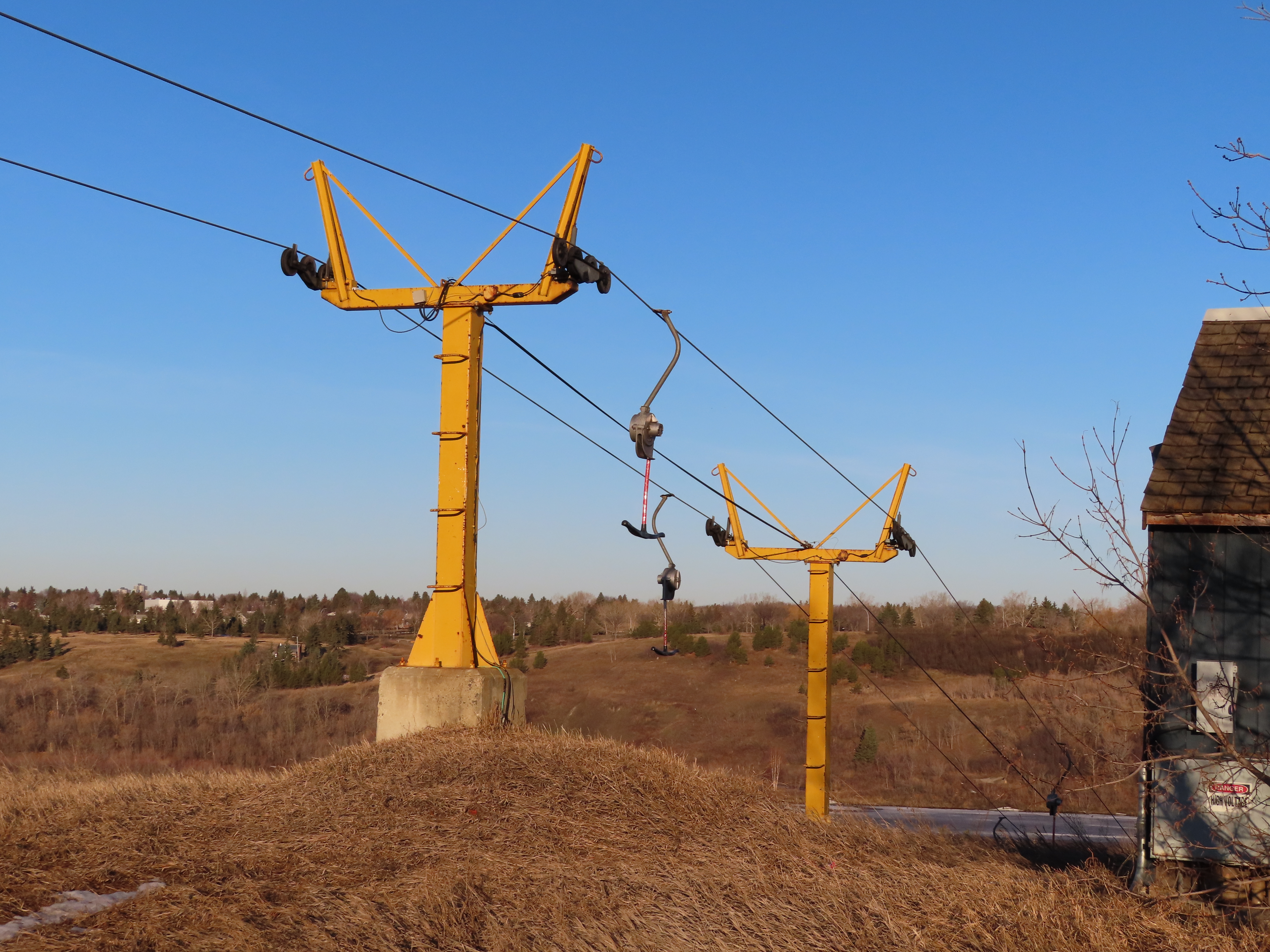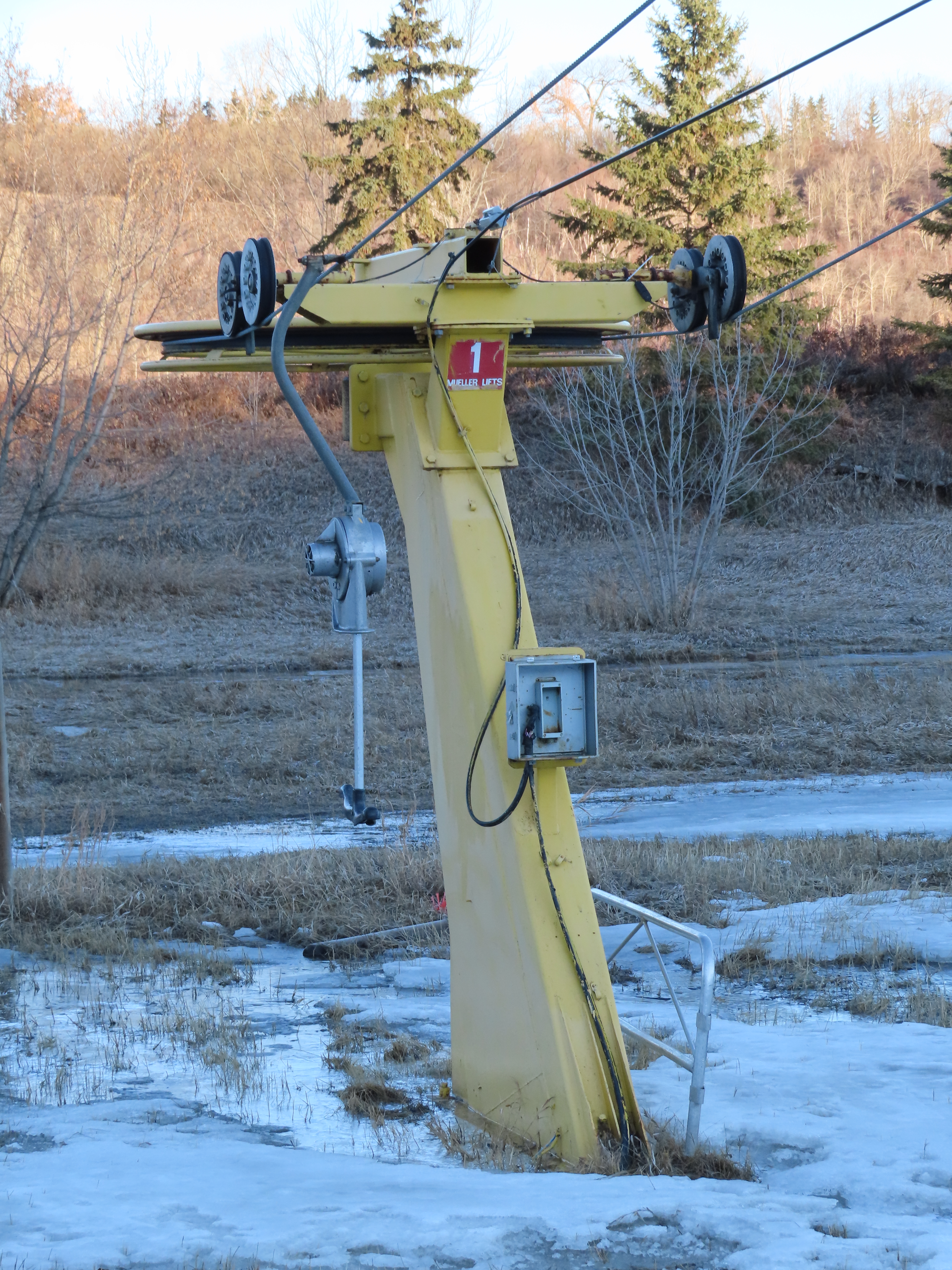 This T-Bar is the last remaining standing of three built at Sunridge in 1979. As of 2019, it is no longer on the trail map.There are only three towers.The bottom station is considered tower 1!T2, really the first tower.View down the lift line.The top terminal with drive and tensioning units.Two towers at the unload point.Upper station area.Side view of the top terminal.
