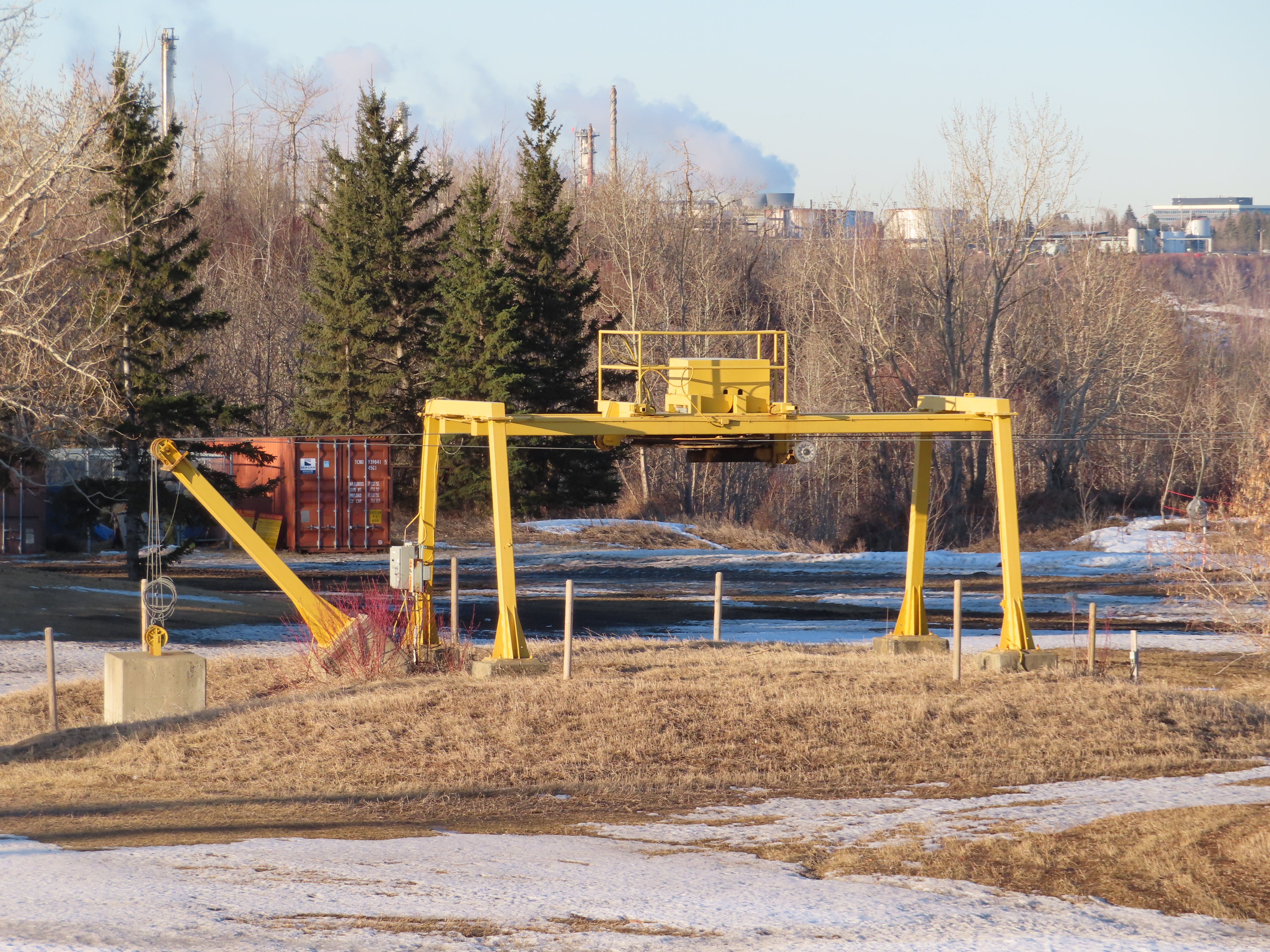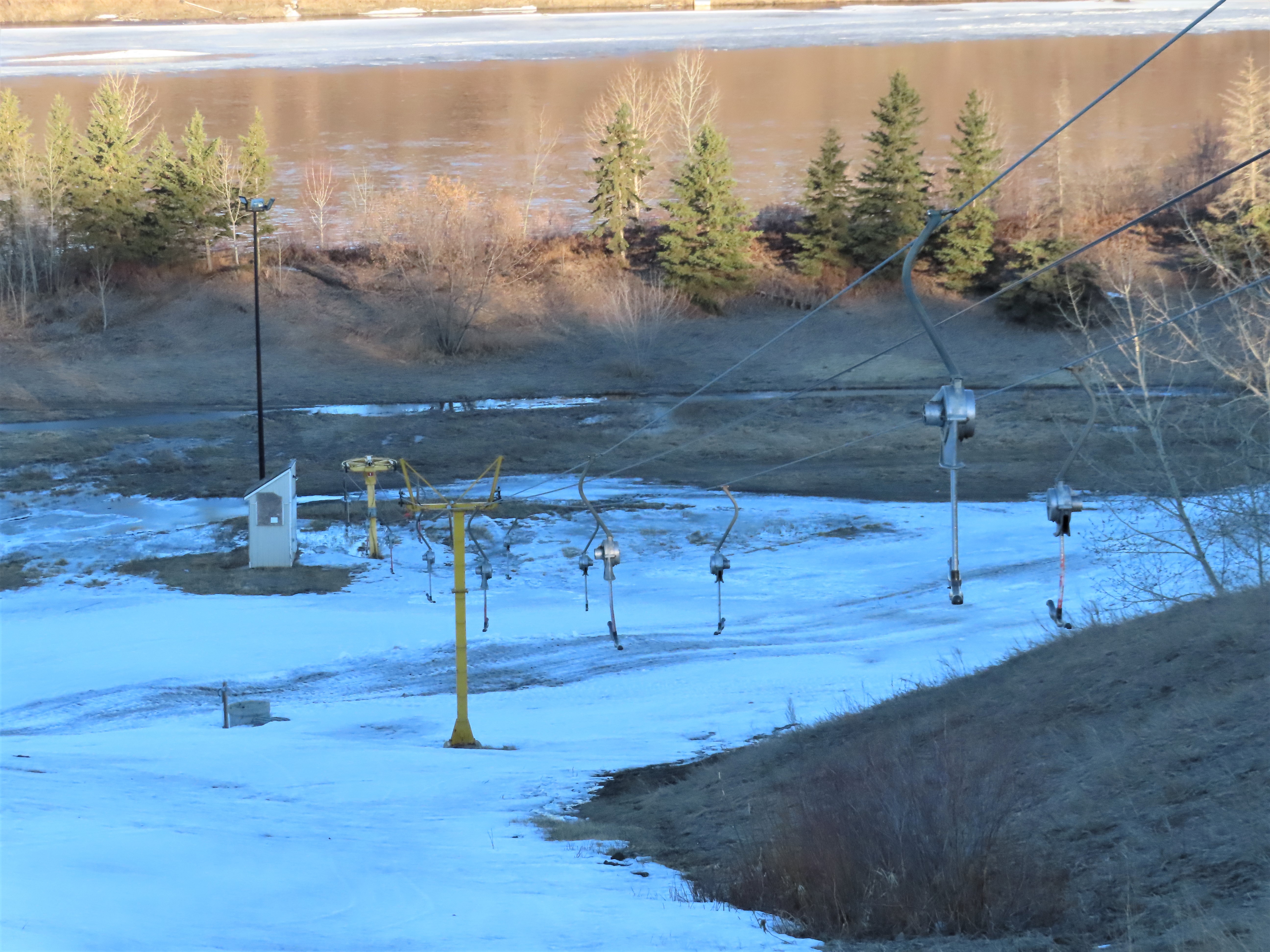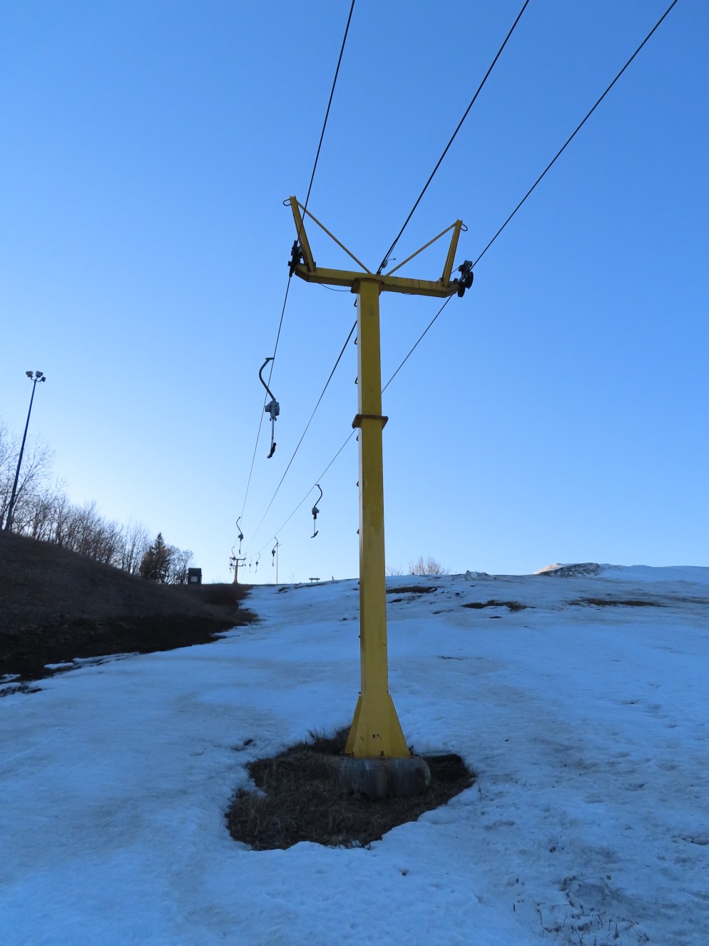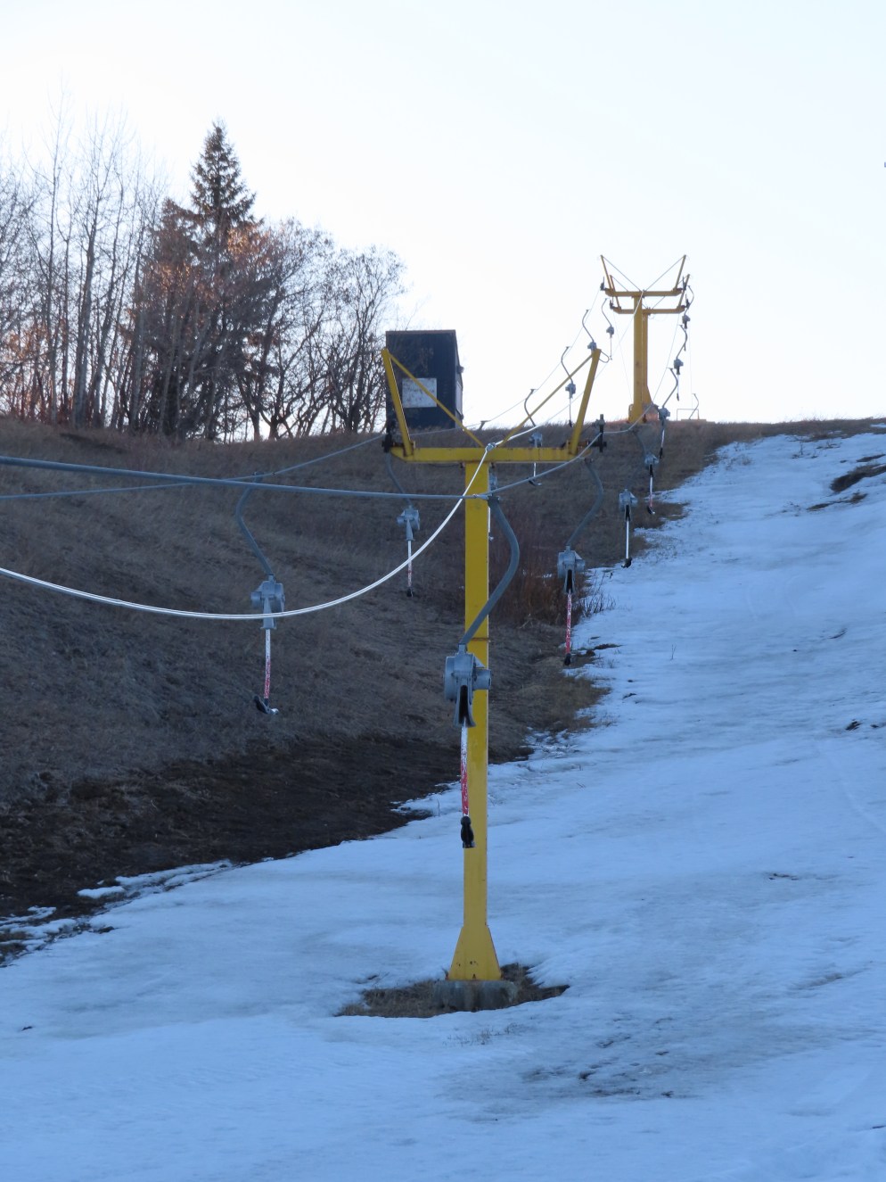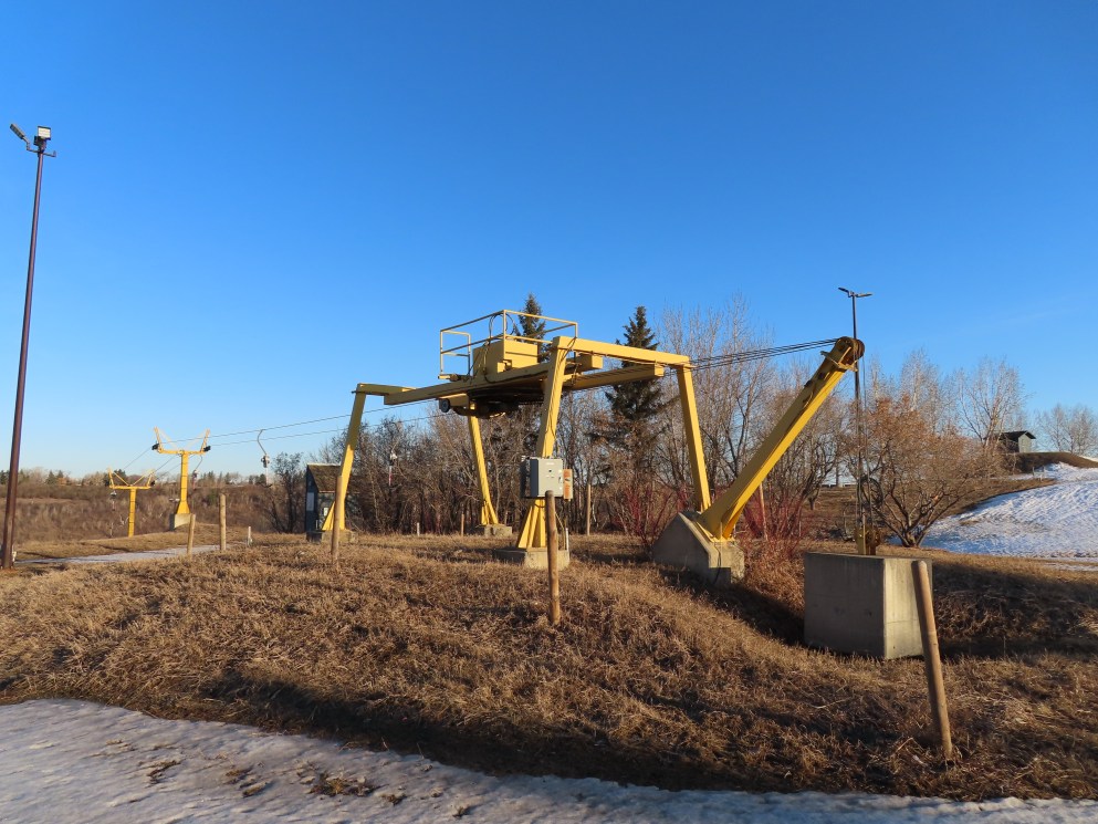 This T-Bar is the last remaining standing of three built at Sunridge in 1979. As of 2019, it is no longer on the trail map.There are only three towers.The bottom station is considered tower 1!T2, really the first tower.View down the lift line.The top terminal with drive and tensioning units.Two towers at the unload point.Upper station area.Side view of the top terminal.